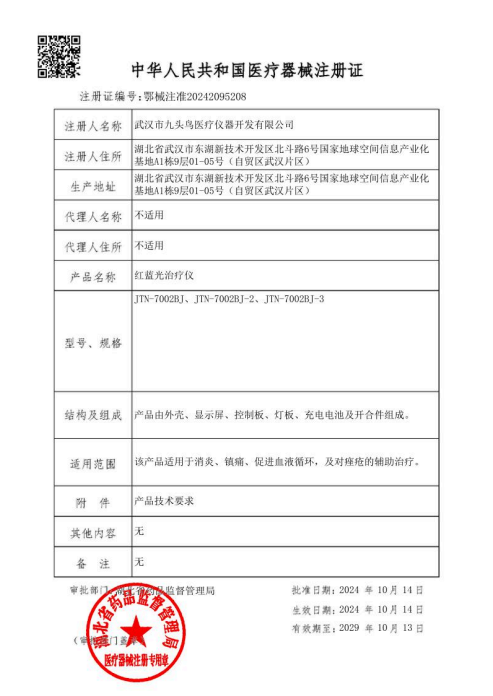 Recently, the flagship product of the Jiutouniao Medical Light Therapy Series— the red-and-blue light therapy device—has proudly received the National Medical Device Registration Certificate!