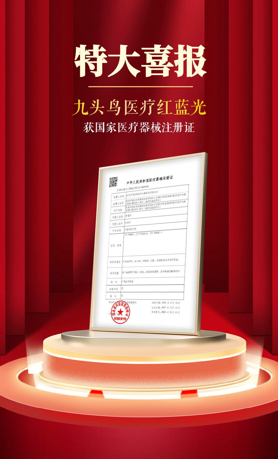 Big news! The Nine-Headed Bird medical red-and-blue light device has received the National Medical Device Registration Certificate!