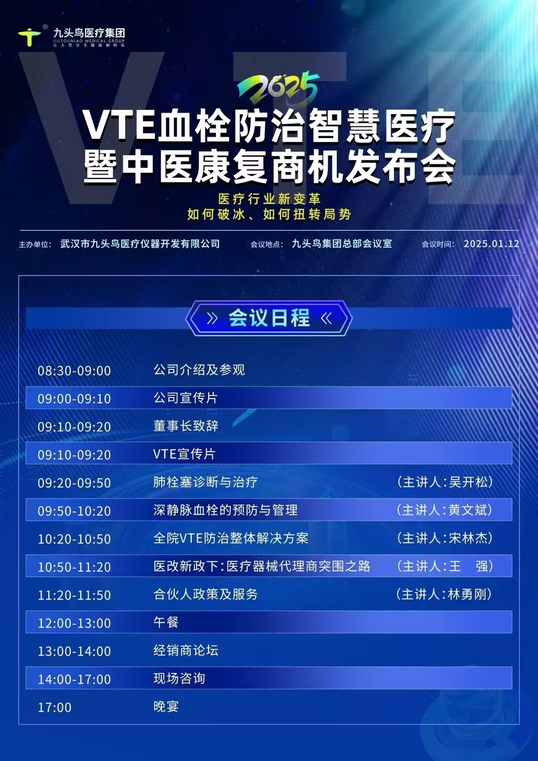 2025 Year 1 Month 12 Day, by Nine-Headed Bird Medical Group Organized by “ VTE The "Opportunity Launch Event on Smart Healthcare for Thrombosis Prevention and Treatment, Along with Traditional Chinese Medicine Rehabilitation Therapy" was successfully held in Wuhan, Hubei Province. The conference brought together leading experts and industry players from across China. A renowned expert in the field Scholars, exploring together VTE Thrombosis Prevention and Treatment Cutting-edge issues and the latest research advancements in the field 。