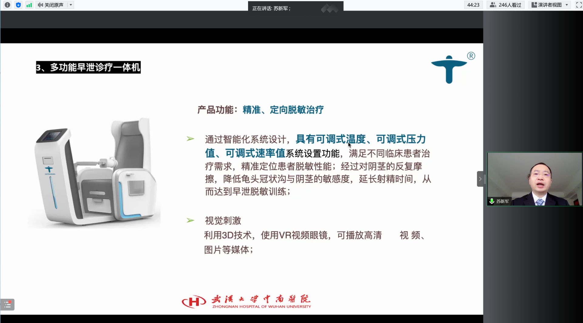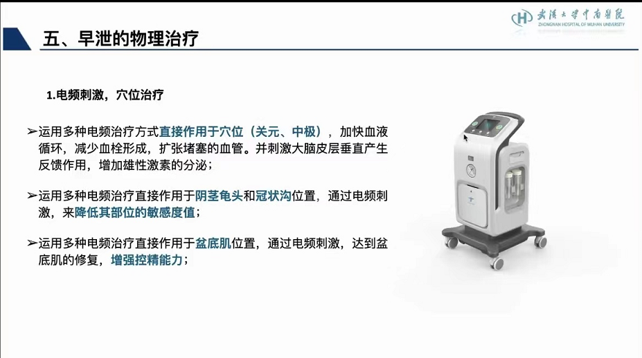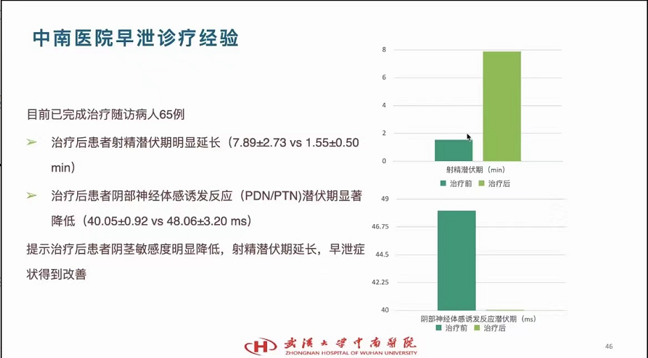 After the conference began, Professor Xinjun Su from the Department of Urology at Zhongnan Hospital of Wuhan University (Center for Andrological Research) shared with us a new conceptual approach to the diagnosis and treatment of premature ejaculation. He specifically highlighted the Jiutouniao Medical Male Sexual Function Rehabilitation Therapy Device—currently used in the department—for physical therapy targeting PE—and also introduced the multifunctional integrated premature ejaculation diagnosis and treatment system, including the ejaculatory latency testing feature. & Precision desensitization training); currently, the department has completed follow-up visits with patients. 65 For example, after treatment, the patient’s ejaculatory latency significantly increased, while the latency of the neurosensory evoked response markedly decreased, leading to an improvement in the patient’s premature ejaculation symptoms.