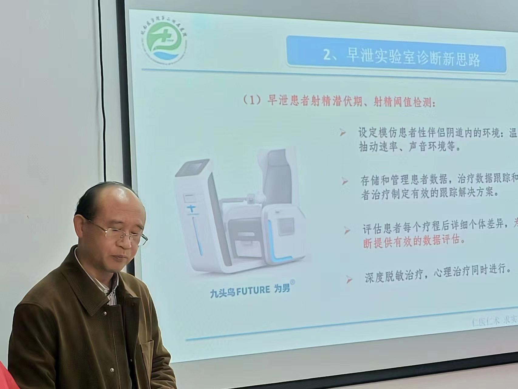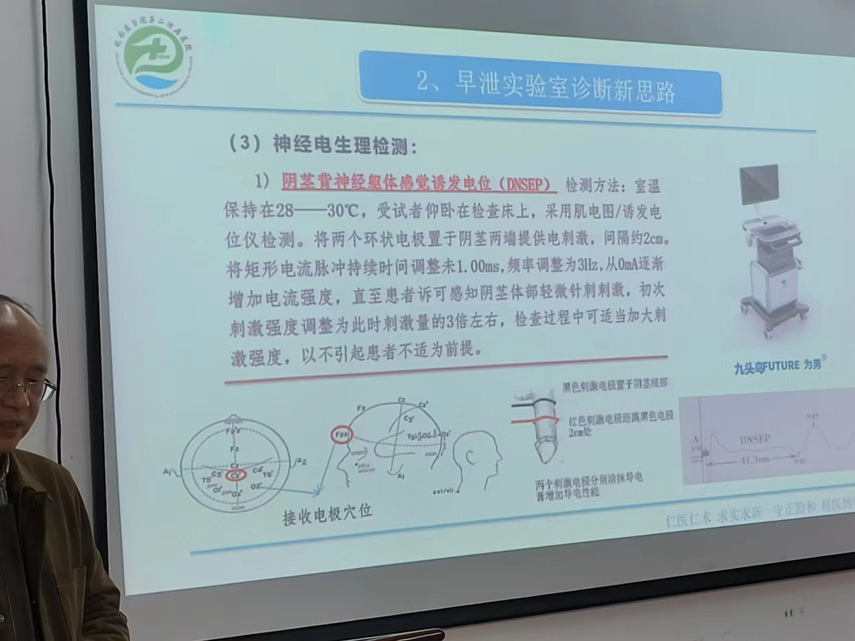 After the conference began, Professor Guo Songlin shared new insights into the diagnosis and treatment of premature ejaculation in men using the Jiutou Niao approach. The Jiutou Niao system for managing premature ejaculation includes diagnostic features such as glans sensitivity threshold testing, neurogenic sensitivity assessment, and ejaculatory latency measurement. Treatment options within the system encompass premature ejaculation desensitization training and hydrotherapy. / Medicinal baths and medium-to-low frequency electrophysiological therapy—these techniques are currently used for men. PE The main diagnostic and treatment methods outlined in the clinical protocol.