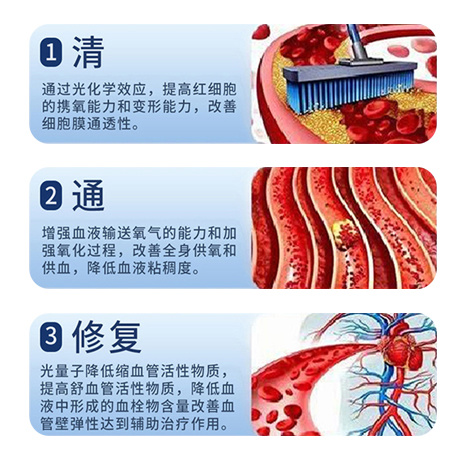 Laser irradiation dissolves lipids and cellular waste in the blood into small molecules, which are then excreted through urine. At the same time, it helps reduce red blood cell aggregation, thereby alleviating inflammation, lowering blood viscosity, and reducing lipid levels in the bloodstream.