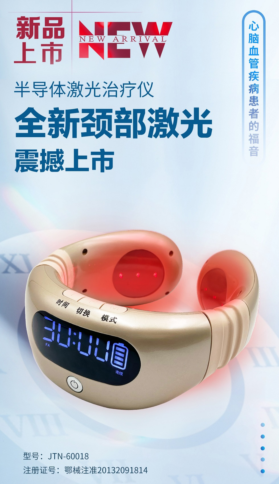 Product Features: 1. High-quality imported laser device ensuring superior quality and effective results; 2. Ultra-large-capacity medical-grade lithium battery for exceptionally long-lasting performance; 3. Ergonomically designed to enhance treatment efficacy; 4. Equipped with a high-definition, large-screen display and powered by advanced American INTEK chip technology; 5. Dual-purpose design—suitable for both neck and nasal treatments, doubling its therapeutic benefits; 6. Multiple laser units: features 16 built-in lasers plus 2 external laser options. Functional Highlights: 1. Cleanses and improves blood circulation; 2. Activates neurons, boosting energy while protecting and nourishing the brain; 3. Reduces blood clot formation and promotes smoother blood flow through vascular channels; 4. Repairs nasal mucosa, effectively treating conditions like rhinitis, pharyngitis, and otitis media; 5. Offers bidirectional blood pressure regulation and helps improve sleep quality; 6. Enhances mental alertness, supports brain health, and boosts cardiovascular and pulmonary function; 7. Strengthens the body’s immune system and alleviates sub-health conditions; 8. Revitalizes skin cells, promoting rejuvenation, reducing blemishes, and improving overall skin tone.